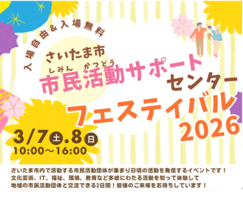 その他公開日:2026年03月11日さいたま市市民活動サポートセンターフェスティバル2026 終了しました!2026年3月7日(土)、8日(日)の2日間に渡り開催した「さいたま市市民活動サポートセンターフェス...