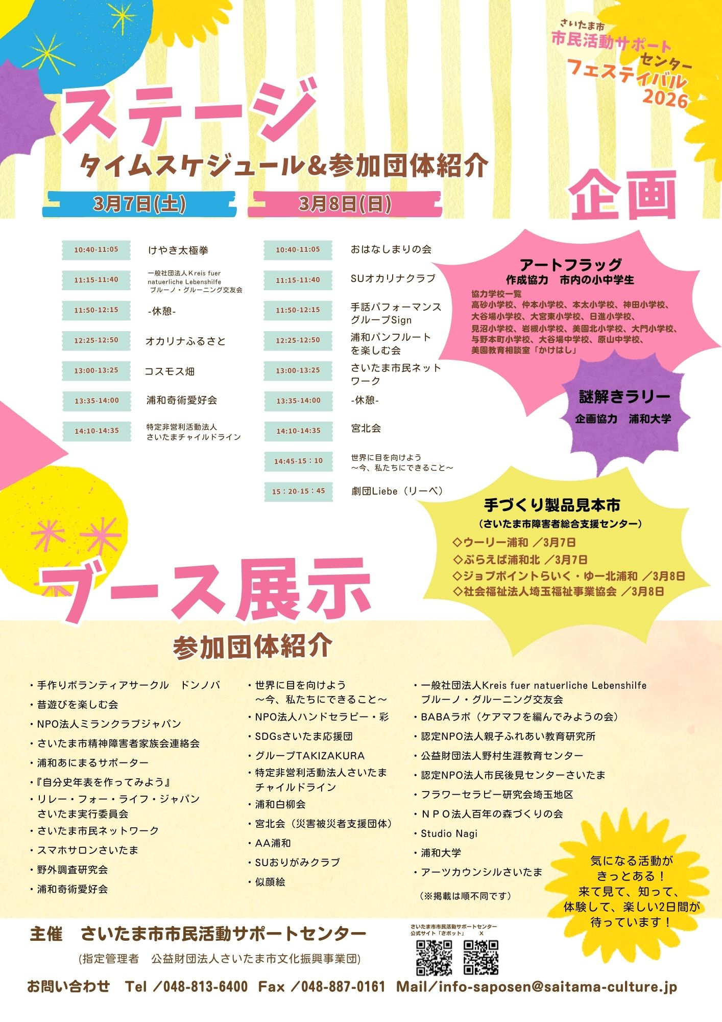 『さいたま市市民活動サポートセンターフェスティバル』を2026年3月7日、8日に開催します。